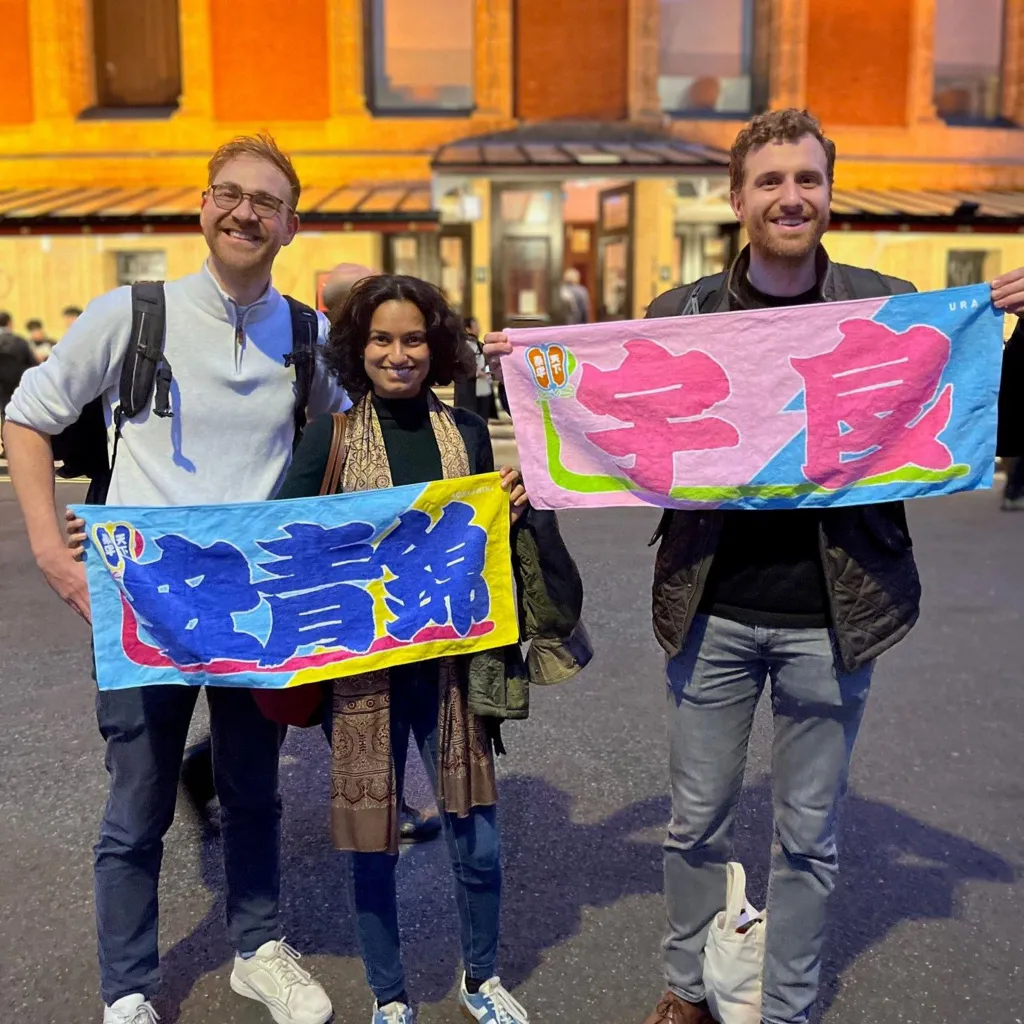 Dan Milne-Morey, Megha Okhai and Caspar Eliot with a few of their sumo towels – which represent their favourite rikishi